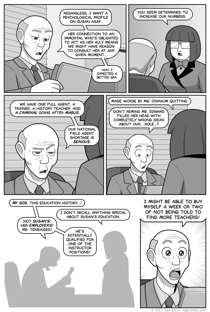 The more I thought on it, however, there was absolutely no reason for Arthur to want Tensaided as a teacher. Arthur has no idea that Susan is fond of Tensaided, and even if he did know, getting Tensaided a job as an instructor wouldn’t accomplish anything big enough, if anything at all, to make it worth it to Arthur.
