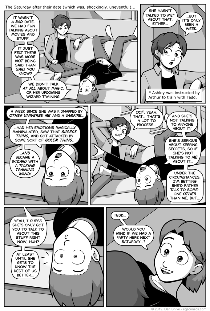 I'm not going to say it's a "good" thing Ashley isn't comfortable going back to Elliot's house just yet, but it's really convenient for getting the party planned for Tedd's house when the party was Elliot's idea. If not for that, there'd probably be a page just devoted to why Tedd's house and not Elliot's.