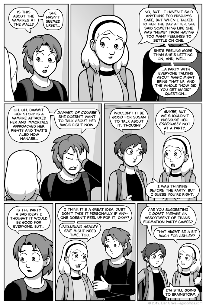The third-to-last panel's note of "good for everyone" was important to me, as I wanted to make it clear that Elliot wasn't just thinking "hey, let's indulge my girlfriend". Helping Ashley's what got the party ball rolling, but it's a party with friends, darn it, and intended as fun times for all.