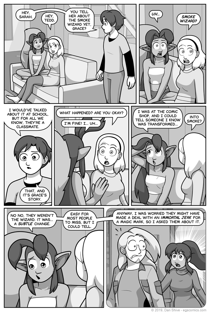 Speaking of events with Sam, I added some thought bubble circles to the previous comic's second-to-last panel to make clear that Grace was remembering things Sam and her had said. Some people interpreted it as Sarah saying things, to which I said "OH NOES" and made adjustments.