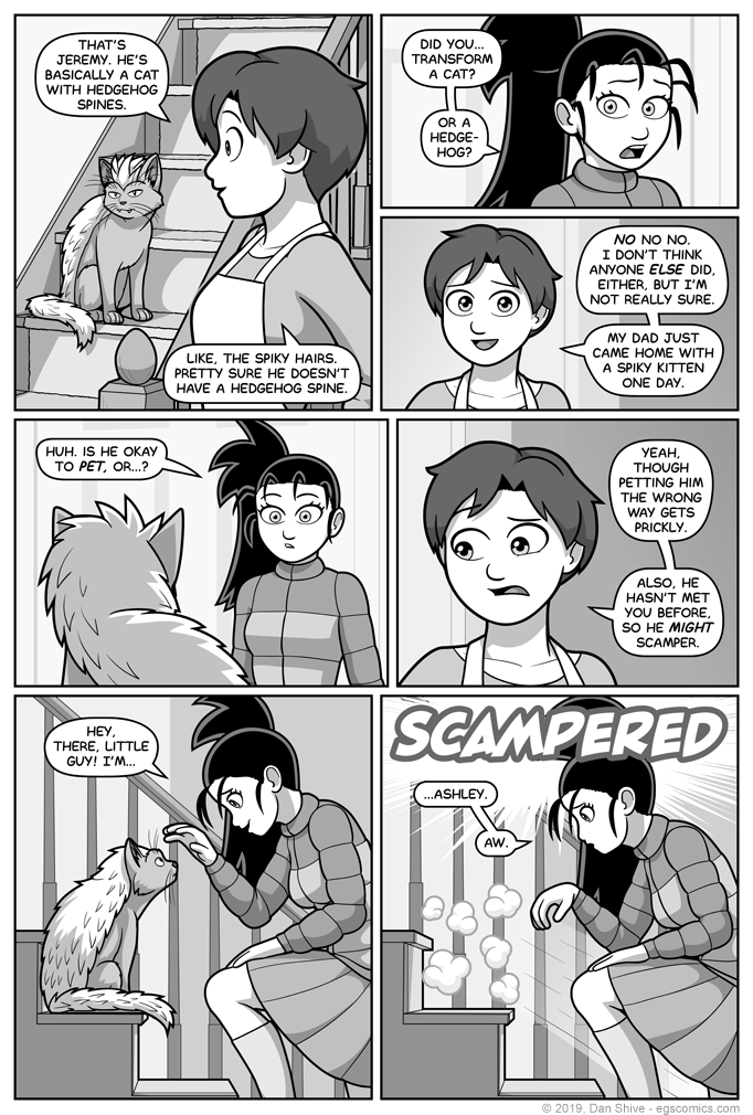 I could probably write a fourth of EGS just by turning clarifications of things I find potentially ambiguous into jokey dialogue. Not that I seriously thought anyone would actually have thought Tedd meant "he has a Hedgehog spine", but I considered it at least possible, darn it.