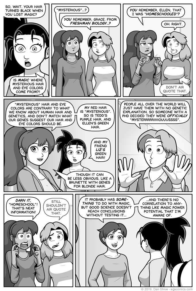 In the history of the comic, people have been given "mysterious" hair and eye colors on whims (or, very early on, because I was terrible at drawing black hair). Any explanation I gave now would have to be convoluted as heck to somehow consistently add up, and it would create rules I'd have to adhere to when designing future characters.