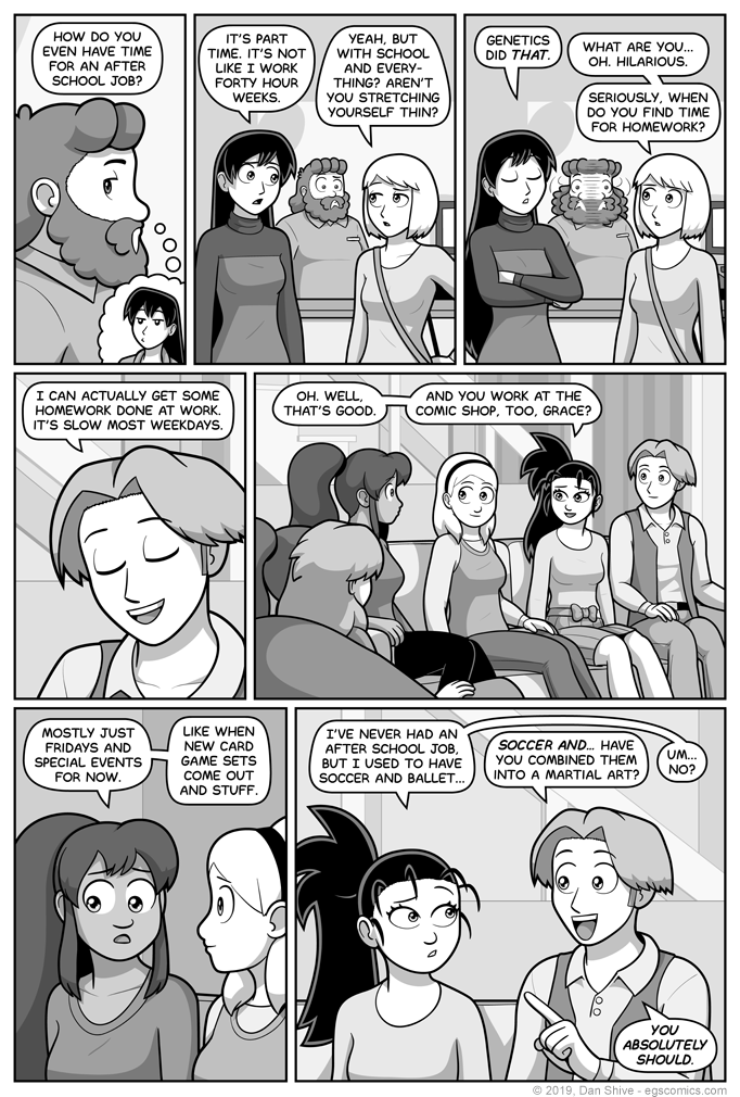 The obvious solution was to shift to someone else for a comic, but everyone at the party were in the same spot talking to each other, and I didn't have anything worth a full page for Susan and Diane yet.
