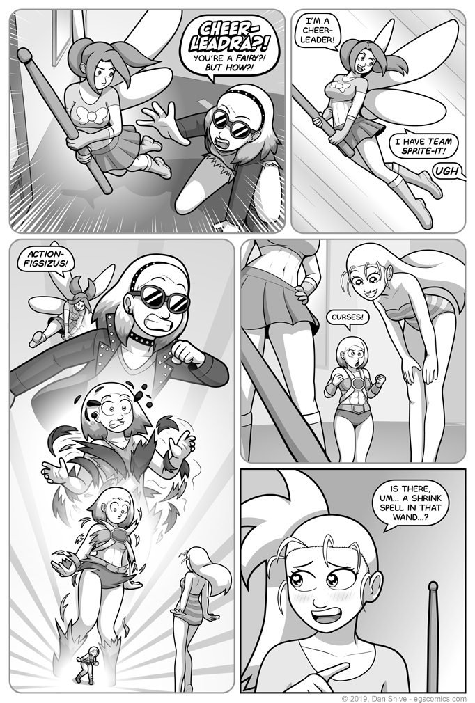 I originally thought I could get this fantasy done in a single page, but then I originally imagined normal Cheerleadra just swooping in and shrinking Sarah, and that would literally be just two panels.