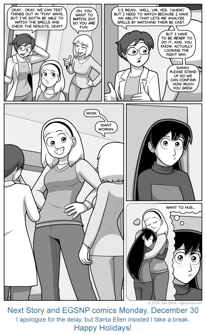 I'd prefer the last panel with out the "want to hug" text, but I really wanted to emphasize the hug-specific nature of this. My intent wasn't Susan suddenly super attracted to giant Sarah, but rather "ye gods, that's one huggable Sarah right there".