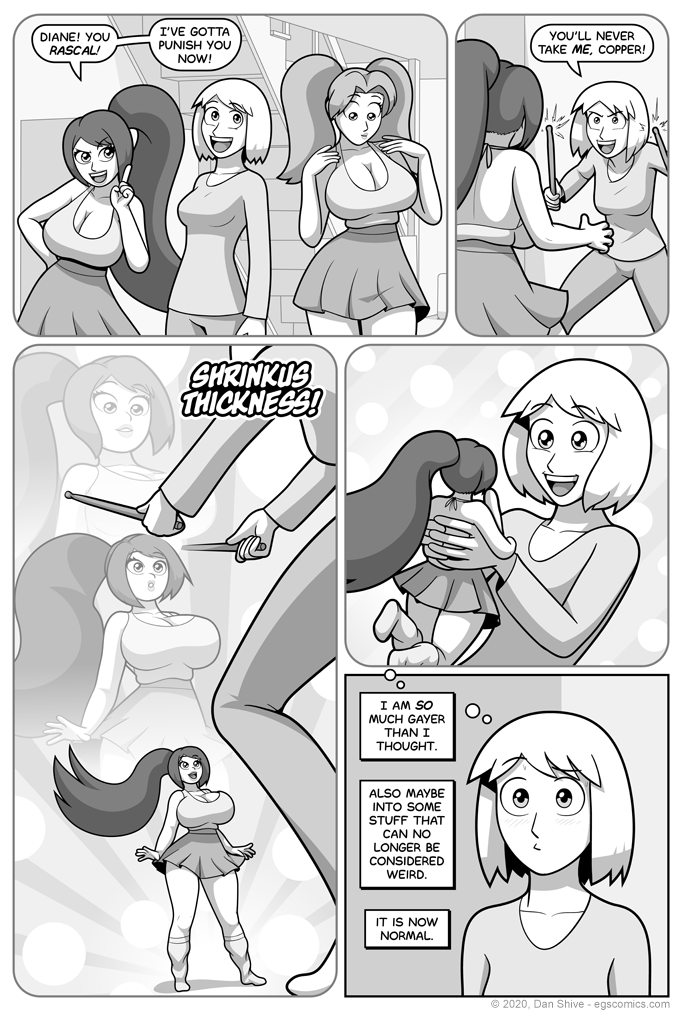 Diane's first thought in the last panel was originally going to just be something she vocalized when Elliot went over to the sofa. I decided that, no, Diane is NOT going to effectively announce to everyone that she thinks female-Elliot is hot.