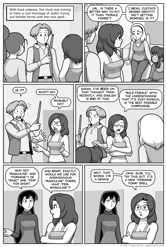 El Goonish Shive has a number of readers who are trans, and I've gotten a lot of comments over the years about "male" and "female" forms. I'm not suggesting every reader who is trans has an issue with it, but I know it doesn't sit well with a number of people.