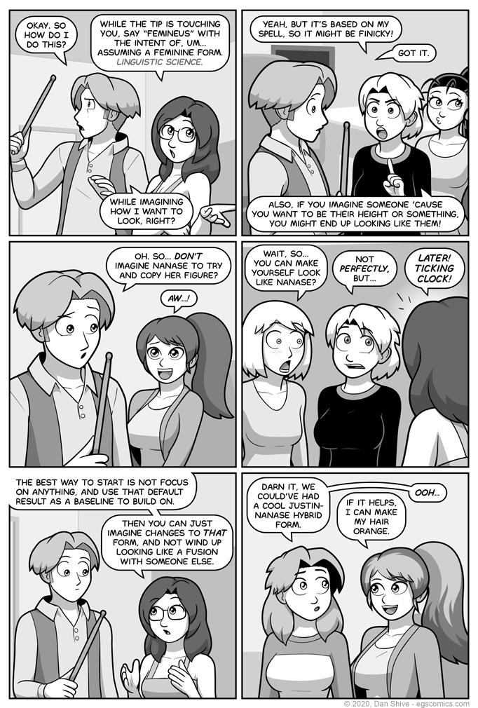 One might see this choice and cry out "HOLD IT! Tedd only heard the suggestion of using 'feminine' forms in the previous page, presumably AFTER making the spell! Why would Tedd have chosen this exact word instead of other options prior to that?!"
