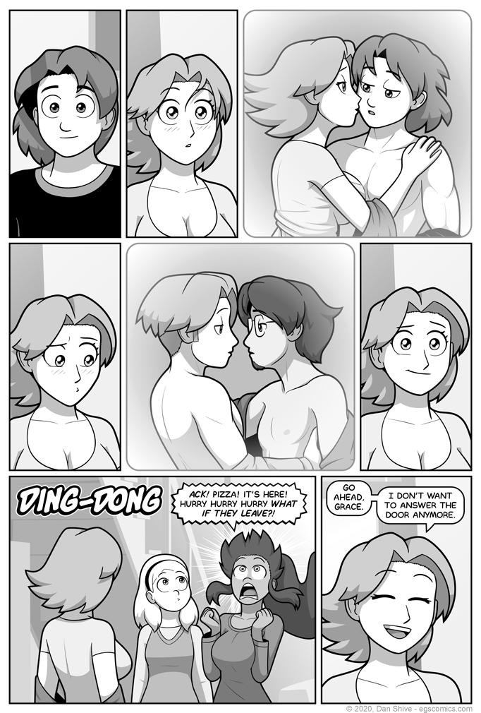 My mind has a possibly paradoxical separation of lust and romance. It's not always paradoxical, sometimes it makes perfect sense, but it almost resulted in panel three of this comic being as-is, and panel five looking like a couple of close, but platonic, guy pals.