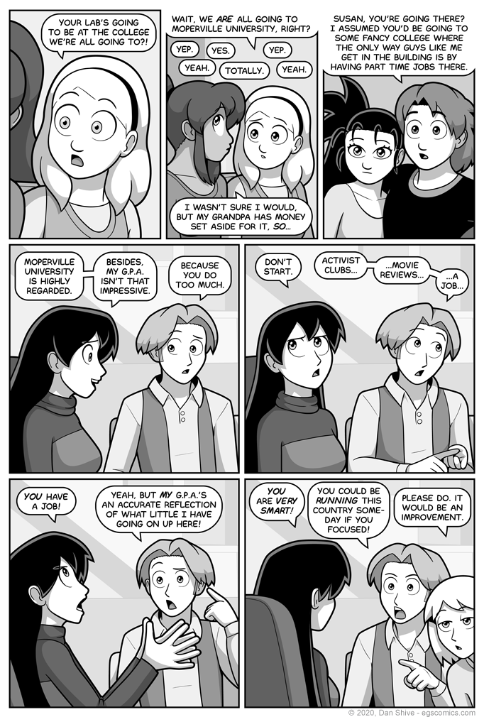 Not just the "yes, they're all going to the same college, nuts to statistical realism, yes to keeping them together, besides it's my story, Moperville University can be THE place to be if I say so" bit...