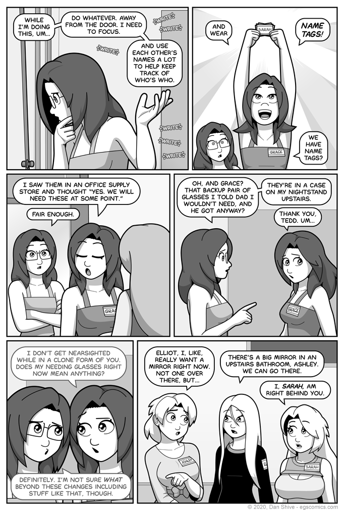 In any case, I warmed to the idea after coming up with an in-universe explanation for why they even have name tags. It's a very "me" explanation (I love office supply stores). I further warmed to it when I realized I could have some fun with where characters chose to place the name tags.