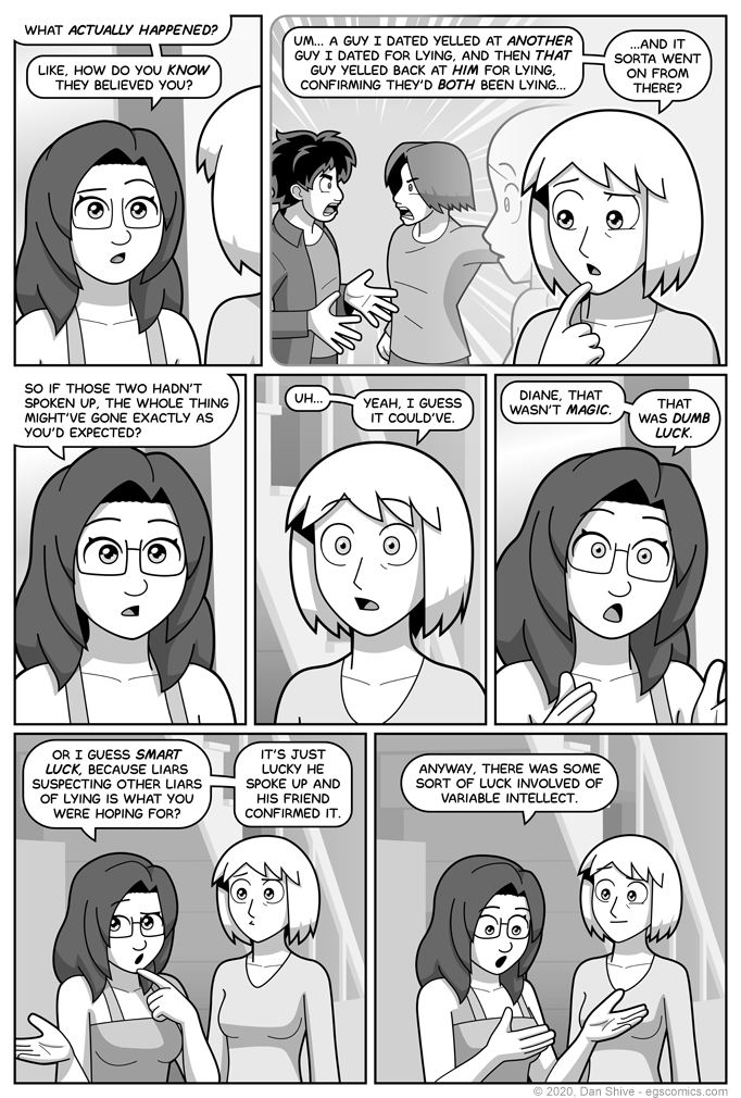 Something I definitely had planned at the time, however, was that the whole thing working ultimately hinged on someone confirming that people were lying. Whether or not she got some sort of boost to believability, it was always going to be a situation in which it would have gone as she'd expected if not for that guy getting mad at his friend.