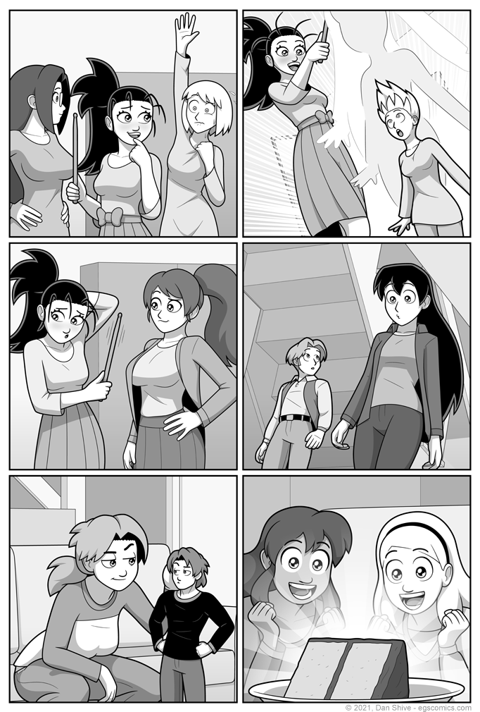 I definitely cheated the apparent size of that piece of cake in the last panel. Like, the cake slices are definitely huge relative to normal cake slices, but cake slices aren't actually that big to begin with. Of course, they can look huge from a first person perspective, looking down at your plate, but then look at someone else holding a plate with their slice. Look how tiny that is relative to them!
