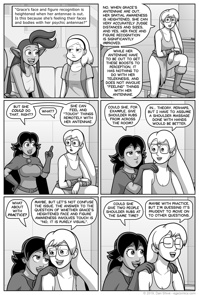 As much as I deliberately intended for Lisa's dialogue to spark the imagination, I truthfully did not plan for Lisa to give Amanda a shoulder massage. I reached a point in drawing the comic, however, where I wanted them to be closer together on panel, and what better way to get them closer together than a delightful gal pal shoulder rub.