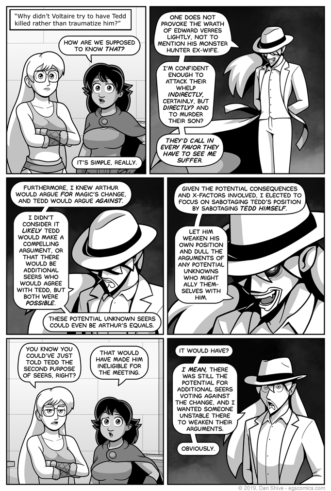While the question in panel one has been asked, the more interesting question, in my opinion, is alluded to in panel five: "Why didn't Voltaire just keep Tedd from participating by telling Tedd about the second purpose of seers?"
