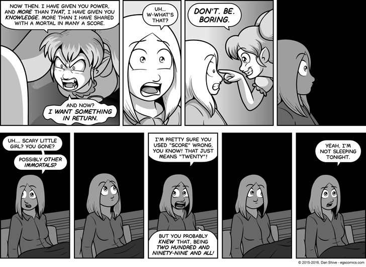 El Goonish Shive Introductions The Goo Shade, Part 1 Q&A #1 Shade, Part 2 Relations, Part 1 April Fools Week Relations, Part 2 Catnip Sister Part 1 - Open The Box Part 2 - Read The Rules Part 3 - Set Up The Pieces Part 4 - Play The Game Part 5 - Knock The Board Over Part 6 - Scattered Pieces Part 7 - Fist Fight Part 8 - Clean Up New And Old Friends Flipping Cardboard Lady Mysterious II slooF lirpA Squirrel Diplomacy Lunchtable Revelations Night Out Part 1 - Martial Arts Crew Part 2 - Elliot's Crew Part 3 - Ellen's Crew The Morning After Q&A #2 Tam Eh Tedd Painted Black Part 1 - Walk In The Park Part 2 - Missing Persons Part 3 - Interviewed By The Devil Part 4 - Into The Dungeon Part 5 - The Truth About Grace Part 6 - The Brewing Storm Part 7 - Fallen From Grace Part 8 - Humanity PB Special Features Shadows After Dark Sleepy Time Second Life The Child Left Behind Red Alert Before The Party Moping Squirrel Intro to South Party Recruiting Even More Recruiting Party Fashion Family Reuinion Grace's Birthday Party Part 1 - Arrivals And Presents Part 2 - Bending Genders Part 3 - Festivities Part 4 - Hold On Hope The After Party Q&A #3 Hidden Genesis Hidden Genesis In The Shadows The New Students Susan Draws The Line Squirrel In The Classroom Sister 2 Part 1 - The Trials Of Susan Part 2 - The Statue Part 3 - Pent-Up Magic Part 4 - Evil Monkey Part 5 - Moperville News Part 6 - Weregirl Part 7 - The Dark Clouds Gather Part 8 - Talon vs. Scythe Part 9 - Wrath of God Part 10 - Pandoras Box Q&A #4 Q&A #4 Bringing Silly Back Indiana Elliot And The TOSF T-Minus The Demon Ally Hammerchlorians - 1 Hammerchlorians - 2 Hammerchlorians - 3 T-Minus Dark Allegiance New And Old Flames - 1 New And Old Flames - 2 New And Old Flames - 3 New And Old Flames - 4 New And Old Flames - 5 New And Old Flames - 6 Q&A #5 Q&A #5 9001% Serious One Way Road Legends of Celida Death Sentence - 1 Death Sentence - 2 Death Sentence - 3 Death Sentence - 4 Death Sentence - 5 What Is Love Summer The End Of Spring Power Fantasy Rocks Fall Nobody Is Hired Nepotism Hair By The Numbers Duel Of The Discs There Be Whales Here There Be Whales Here Pt 2 There Be Whales Here Pt 3 The Dawn End Of An Era End Of An Era pt 2 Family Tree Family Tree Part 2 - Arrival Family Tree Part 3 - Par-TAY Family Tree Part 4 - Weirdness Family Tree Part 5 - A Troll Family Tree Part 6 - Banhammered Family Tree Part 7 - Hangover Q&A #6 Identity Identity Part 2 - Reactions Identity Part 3 - Cat Attack Identity Part 4 - Detective Sarah Identity Part 5 - Basement Chat Identity Part 6 - ILLOGICAL! Identity Part 7 - Dreams identity Part 8 - Ashley Identity Part 9 - Detective Susan Identity Part 10 - Ashley and Elliot Identity Part 11 - Epilogue Summer Moments Guest Comics Guest Comics #1 Guest Comics #2 Pandoras Box Squirrel Prophet SP - Part 2 SP - Final Battle So A Date At The Mall So A Date - Part 2 So A Date - Part 3 So A Date - Part 4 So A Date - Part 5 EGSNP - Question Mark Q&A 7 - The Requestioning Sister 3 - Catspaws Part 1 - Legacy Part 2 - The Will of Magic Part 3 - Reply Hazy Part 4 - Everyone Needs To Talk Part 5 - The Reservoir Part 6 - Maybe Sisters Part 7 - An Unkindness Part 8 - Awkwardness Ahead Part 9 - Traffic Freeze Part 10 - Fluidity Part 11 - All Of The Curse Words Part 12 - Misanthropy Part 13 - In Search Of Wisdom Part 14 - Sister Anxiety Part 15 - Elliot and Ellen Part 16 - BFFs Part 17 - Great Fairy Godmother Part 18 - Gathering Monsters Part 19 - Family Meetings Part 20 - Geminis Part 21 - The Other Dunkel Part 22 - Apocalypse Part 23 - The Fate Of Magic Part 24 - Elliots And Ellens Part 25 - Changes Part 26 - Epilogues The New World The Legend of Diane The Secret of Sam Q&A 8 - The Lord Of The Q&As Title Pending Title Pending 2 - Even More Pending Title Pending 3 - Untitled Party Title Pending 5 or 6 Balance Part 1 Part 2 Part 2-B Part 3 Part 4 Part 5 Part 6 Part 7 Part 8 Part 9 The Road Ahead Brother Father Our Future Recruitment Layers, Part 1 Layers, Part 2 Layers, Part 3 Layers, Part 4 Hope, Part 1 Hope, Part 2 Hope, Part 3 Hope, Part 4 Hope, Part 5 Hope, Part 6 Hope, Part 7 Hope, Part 8 Hope, Part 9 Hope, Part 10 Hope, Part 11 Hope, Part 12 False Kings False Kings, Part 1 False Kings, Part 2 False Kings, Part 3 False Kings, Part 4