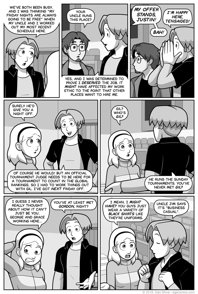 Granted, Tensaided having an interest in hiring Justin, there being unseen employees named Gil and Gordon, and Justin being an "official" tournament judge isn't exactly on par with, I dunno, the origin of orcs in Middle Earth, but I can still enjoy it. I'm also happy to have it stated that the employee "uniform" is simply wearing some variety of black shirt.