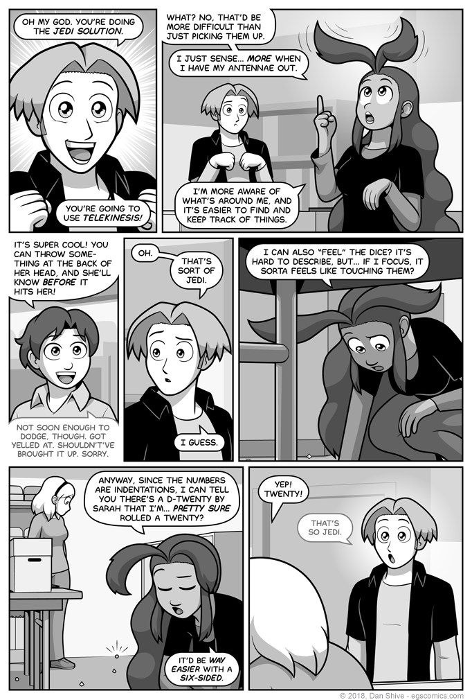 Panel six got rewritten a bit after I tested touching twenty-sided dice myself. She was originally more certain, but if what she's sensing is similar to touch... Yeah, that's easier said than done. About the only reason she's pretty sure it's a twenty is because of the width of the indentation.