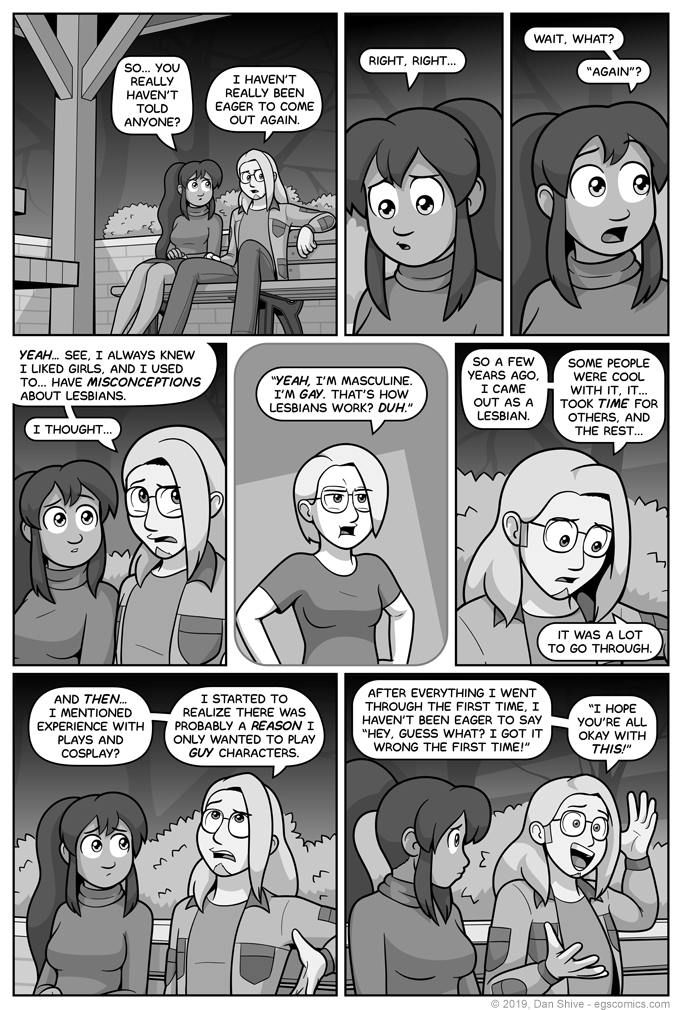 Sam having come out before is inspired by a lot of stories I've heard from people over the years. Not stories about this specifically happening, but just in general about how gradual discovery and reassessments can happen over time, and the sort of epiphanies that can happen about one's identity and how they can come about.
