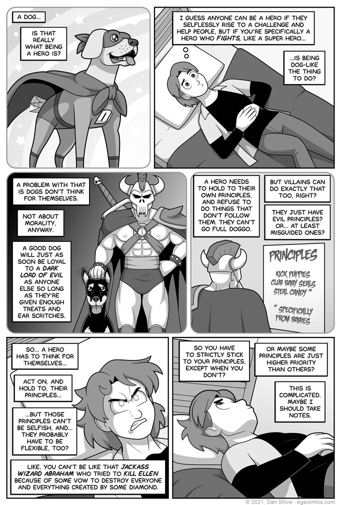 And yes, the principles in panel four do seem a bit contrary to what has evidently been achieved in panel three, but you can't have a list of stereotypically cartoonish evil things without including the kicking of puppies. Maybe he only kicks other people's puppies?