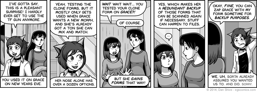 Tedd somehow looks more masculine to me than normal in these past two comics. Something about the hair, maybe? She'd fit right in on That Seventies Show.