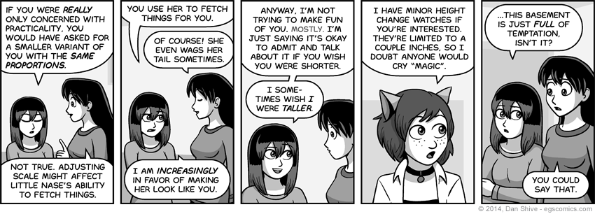 Nanase's point in panel one of this comic was something that occurred to me as I was making the comic in which Susan made the height request, and it is a fair point. Of course, the end result would effectively be smaller than Little Nase is now in every regard but height, so it's also fair to say she wouldn't be around the same size, which is supposedly the point.