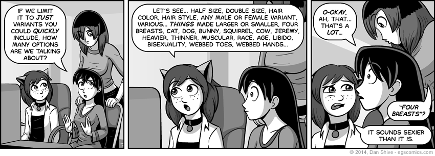 As mentioned in the previous commentary. this comic was essentially going to be, well, a commentary. Basically, just Tedd listing a whole bunch of options and what-not. I prefer it in comic form, because really, it makes sense to ask what the ready-made options are, particularly when there's a giant Nanase who's been a good sport but is growing a little impatient nearby.