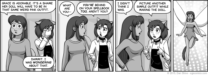 Anyway, I want high-fives for my restraint regarding exposition with this comic. No lengthy explanation of what outfits are acceptable, no math, etc. Just "picture a simple outfit" and BAM. Fairy doll Grace.