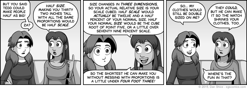 One of the reasons I bring this up now is that I'm not likely to have a Q&A anytime soon, and a relatively recent EGS:NP resulted in questions regarding whether Tedd had figured out how to go beyond previous size change limitations. He hasn't. The cube root of 2 is about 1.26, i.e. the "26% bigger" Grace once referred to. Half and double-size has been within Tedd's reach for a while now.