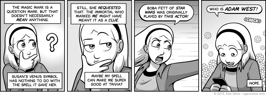 I bring this up because some people were asking why Sarah was concerned with the shape of the magic mark when the shape doesn't actually determine what the spell is. She doesn't really have a lot to go on, and "it could be anything" isn't particularly helpful regardless of whether it's technically accurate. She may as well see if she can figure something out based on the assumption that it might be an intentional clue.