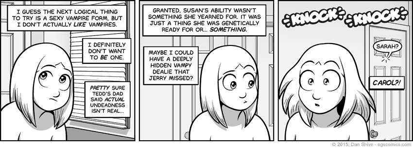 The primary challenge of this comic was making it clear that Carol was NOT in the room with Sarah. I mean, ultimately, it wasn't THAT big of a challenge. I just had to settle on a layout for Sarah's room and actually show the door. Nonetheless, that was the challenge this comic presented.