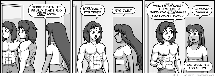 I actually wrote the next EGS:NP before this one, which has a joke that can fit many RPG video games. I decided I wanted Grace to specifically be playing Chrono Trigger, however, so I wrote this comic. Once that was established, I got an idea for something else, and suddenly I had a script for Friday's comic.