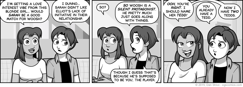This comic was a real struggle to write, mostly because I only had the comparing of Elliot to a silent protagonist and the goal of Grace giving Marle a custom name at first, and the only names I could come up with that Grace would naturally choose after maybe a minute of knowing the character were either nonsense or barely chuckle worthy. It wasn't until Woosh = Grace slapped me upside my head with its obviousness that everything fell into place.