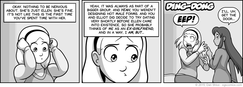 I initially drew Sarah in this storyline without a hairband for a change of pace, but I found myself almost immediately missing it. Looking back at earlier strips in the storyline, I find myself thinking she looks okay without it... I'm going to be going back on forth on whether I prefer she wear it, aren't I? Ah well. I made a decision, and she wearing one now.