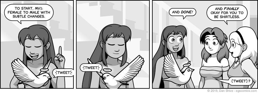 Much like the previous comic with the angelic tweeting bird and the commentary therein, this is a comic that could prompt a predictable discussion about shirts and the okayness of their absence. It could, therefore, be considered in my best interest to address that right here and now so as to prevent an onslaught of questions and opinions being sent to me.