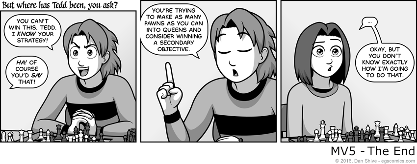 It's possible I spent a bit too much time and effort making sure their chess game was accurate. I bought a 3D model of a chess board and its pieces, and used it to play an actual game against myself up to a point I felt would genuinely work for the comic. I didn't know which side would be Tedd or Elliot until I reached that point, and I played both sides to win as best I could (which no doubt was amateur hour, but still).