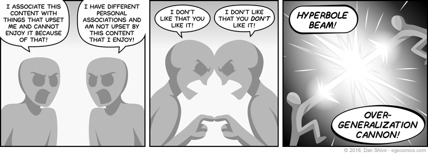 Cleverly, or so Dan thought, Dan was very vague about the actual positions being expressed, and chose grey, nearly featureless beings as representatives. It was not long after posting the comic that a group of grey, nearly featureless beings from beyond the veil of time and space took issue with his comic, and called him a woodlewap. None within our corporeal reality know what exactly a woodlewap is, but the sentiment was clear enough.