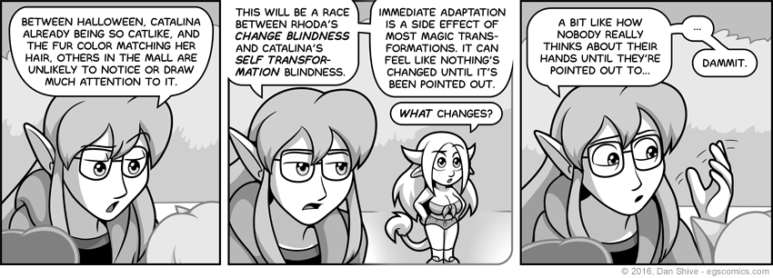 There's more that could be said about this, such as the implication that muscle memory must be affected and such, but really, I wasn't sure if I was going to bother clarifying this at all beyond mentioning "self transformation blindness". It's a bit technical and difficult to fit in to the comic naturally, though I defend it with Pandora via the assertion that she (and probably most immortals) talk to themselves a lot.
