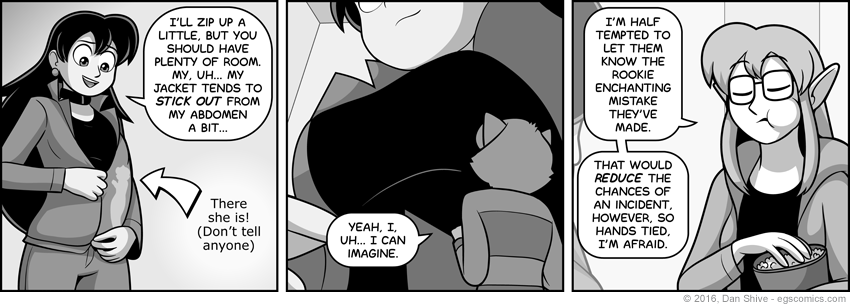 A pseudo point of view from inside Rhoda's pocket in the next panel? Temporary... Something, anyway. Not entirely sure what's going on, there, but I hope it gets the point across.