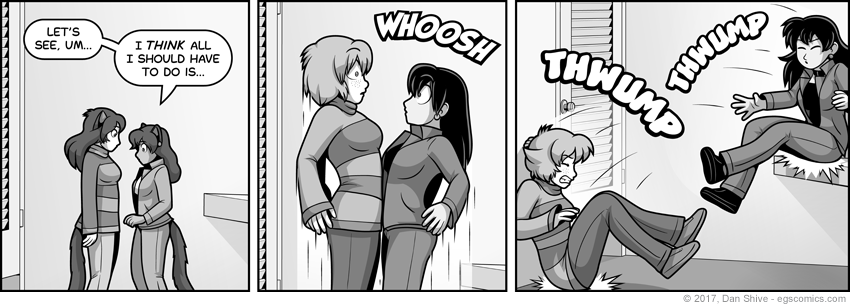 A small detail in this comic is Catalina managing to put her left hand behind her head before hitting the floor. I was all like "what if Catalina hit head on wall?", and then I was all like "you cartoonist. Can keep from happen", and then I was all like "sweet". I'm not sure what was up with my grammar while thinking these things, but it was before lunch, so that might have had something to do with it.