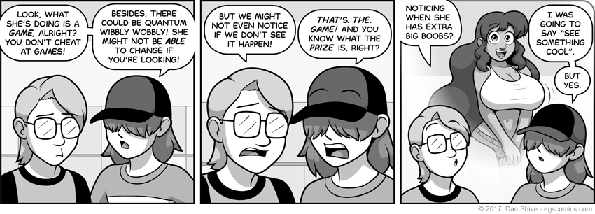 Shockingly, there are particular things on the minds of these teenage boys, and they get their science logic from Doctor Who. Granted, I don't recall the actual explanation for why Weeping Angels from the series can't move when being looked at, but I have no doubt that "quantum wibbly wobbly" is as satisfactory an answer as any.