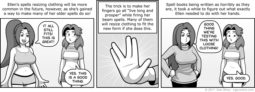 With that in mind, it FINALLY occurred to me that, if Ellen can get different results by putting her hands together, she could also potentially get modified results in other ways. This way, she can make clothing fit just fine with FV5 without it being an absurd retcon.