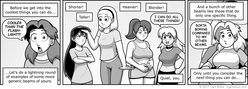 Rhoda's comment, and Ellen being shorter / smaller / heavier / blonder and held by Rhoda in the last panel, weren't originally planned. Rhoda was primarily chosen because I wanted her in there somewhere to show that Susan had become the same height as her.