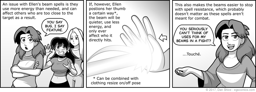 And now, a confession: When I posted the previouc comic, I was planning for a different hand pose that would apply a transformation to someone, but ONLY affect their clothing. For example, Ellen could zap Nanaze with that heavy beam, use this hand pose, and Nanase wouldn't change, but her clothing would resize as though to fit the heavier form.