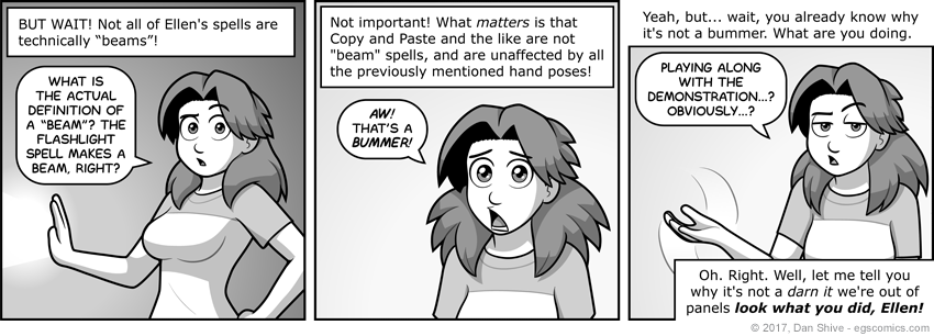 It's not too difficult to sort out what this means, but between wanting to make a joke about the flashlight spell being "a beam", and pointing out the distinction between beam and not-beam spells, I felt things were a bit cramped for a proper visual demonstation that would cover everything I wanted.