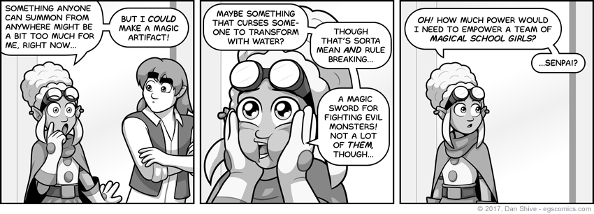 While I don't plan on revealing Hanma's exact age (or am even sure of it myself), it's been suggested to me that she should have last reset during the 90s, and found herself in the middle the explosion of anime popularity that happened in the USA back then. That 100% makes sense to me, and fits with the general canon that she's significantly older than "new" Jerry while not being at an age that would make her overly powerful.