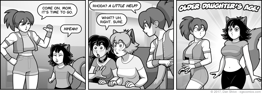 I thought of three outcomes for the last panel, and put them to a vote. In addition to "Mrs. Kitsune becomes Nanase's age", there was "Mrs. Kitsune becomes even younger so Nanase can carry her out", and "Nanase becomes Akiko's age". In the end, Mrs. Kitsune becoming Nanase's age won by a fairly large margin, with Nanase becoming Akiko's age in second place.