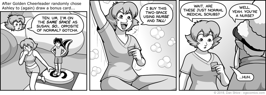 - Golden Cheerleader effect - I didn't want to devote a lot of space to a player being chosen at random and drawing a card, but I did want to acknowledge it. Granted, I could have done something with Ashley getting the card again, but nothing I came up wih felt good enough to justify devoting a comic to it.