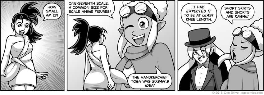 "Well, obviously, 1:7 scale was chosen for a reason that's relevant to Hanma, but the toga doesn't have anime relevance, and was instead suggested by Susan, who has wound up seeing a lot of movies and who has seen the likes of Dr. Cyclops and whatnot, and she logically assumed it would cover more of Ashley's legs. OBVIOUSLY."