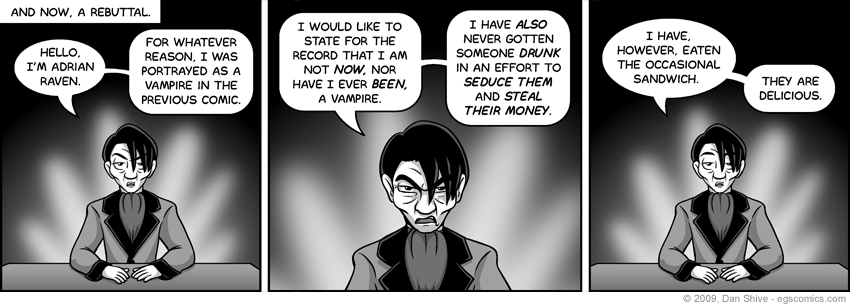 While I worry that this strip may feel a little redundant, I found the idea of Raven giving a rebuttal amusing and his declaration of sandwiches being delicious hilarious, so here we are. The next strip will be more "for something completely different" than "a rebuttal".